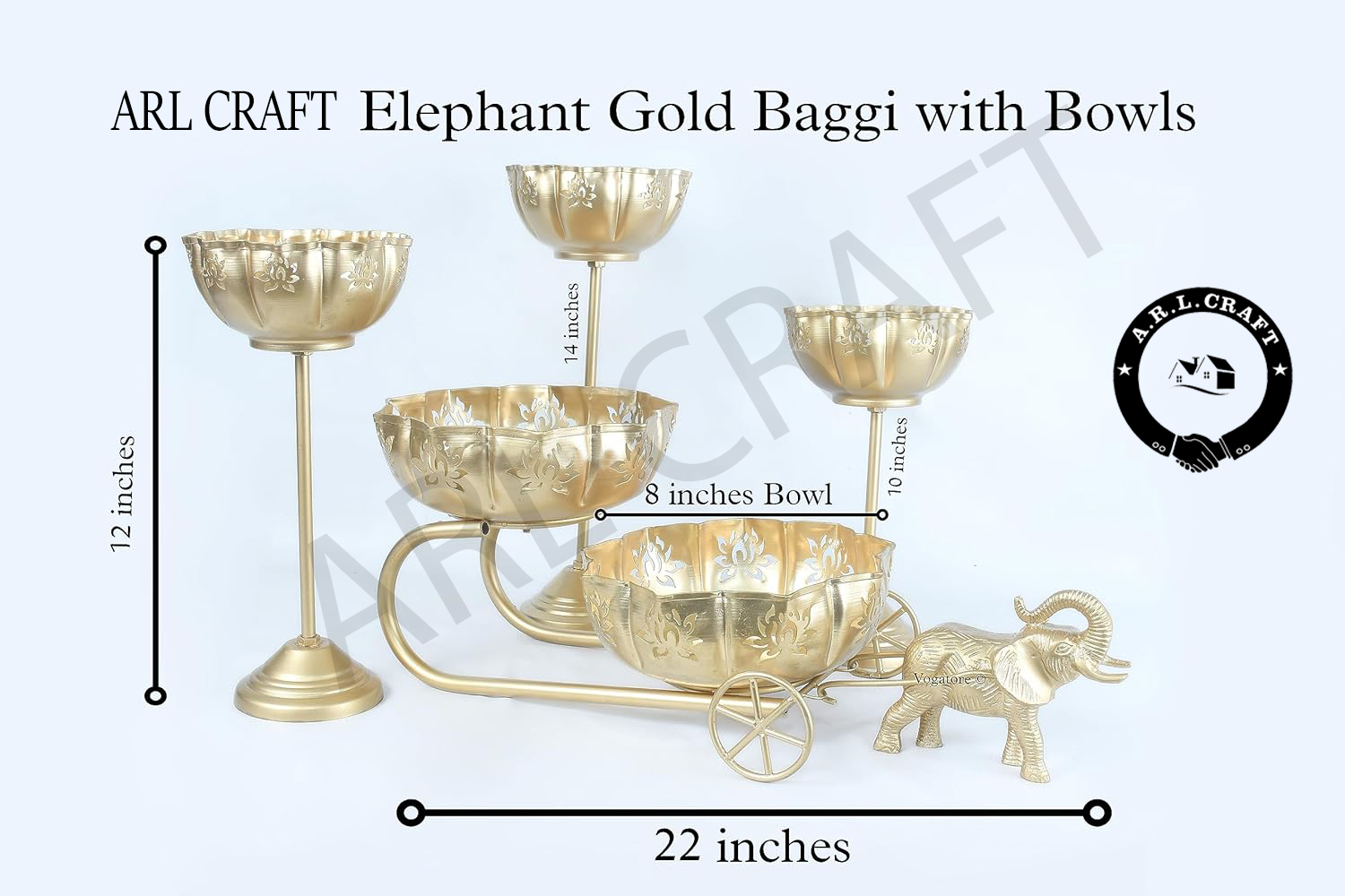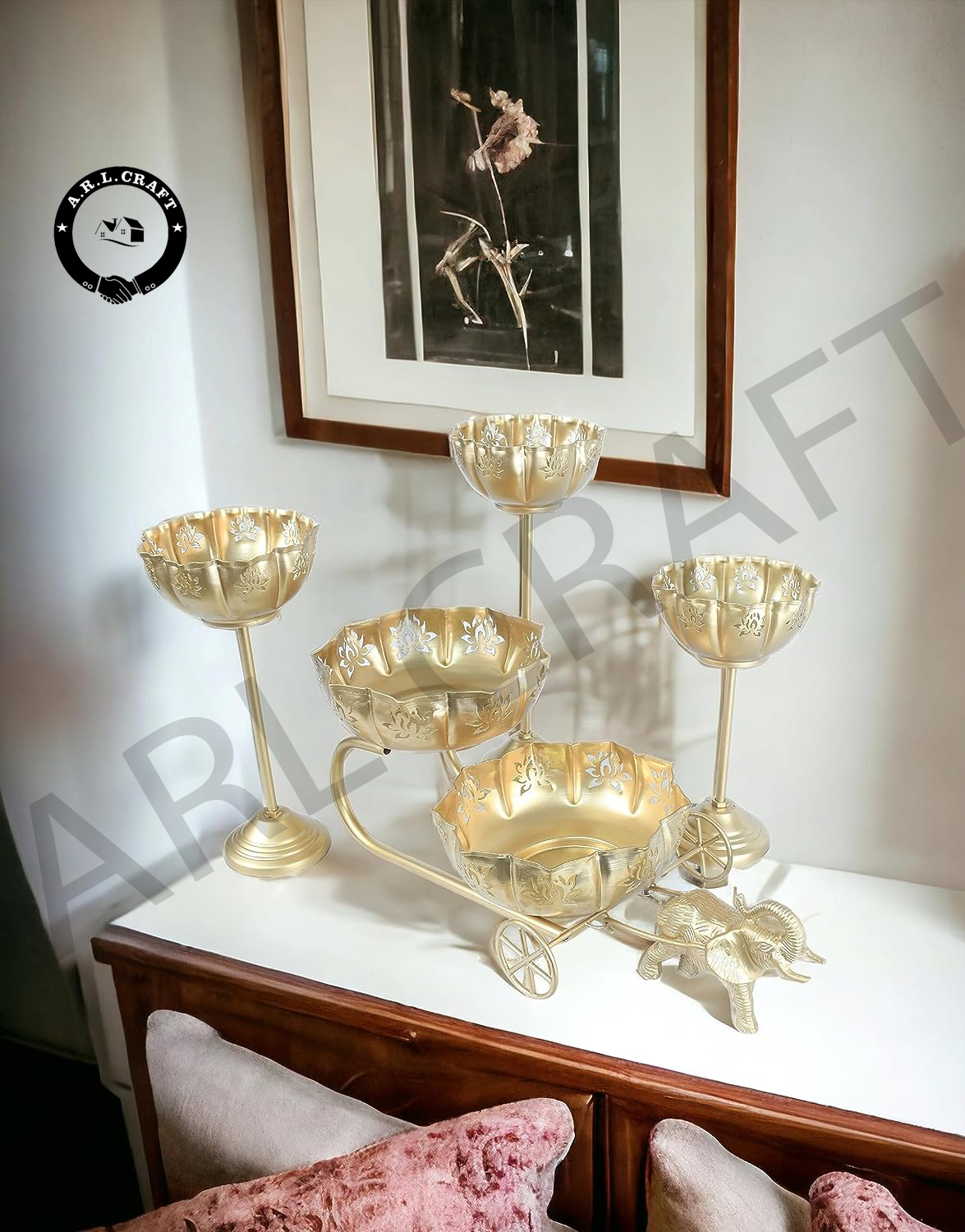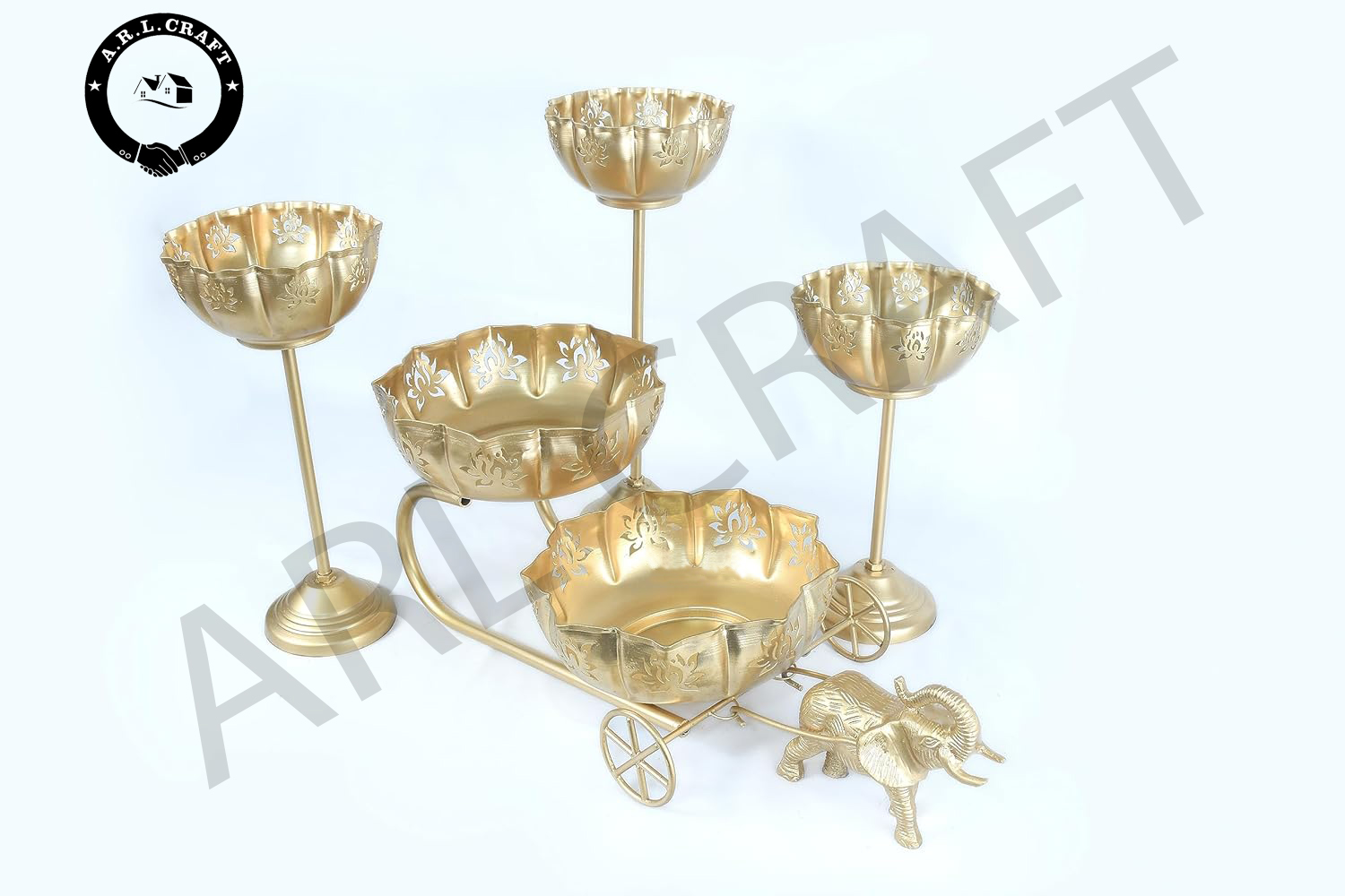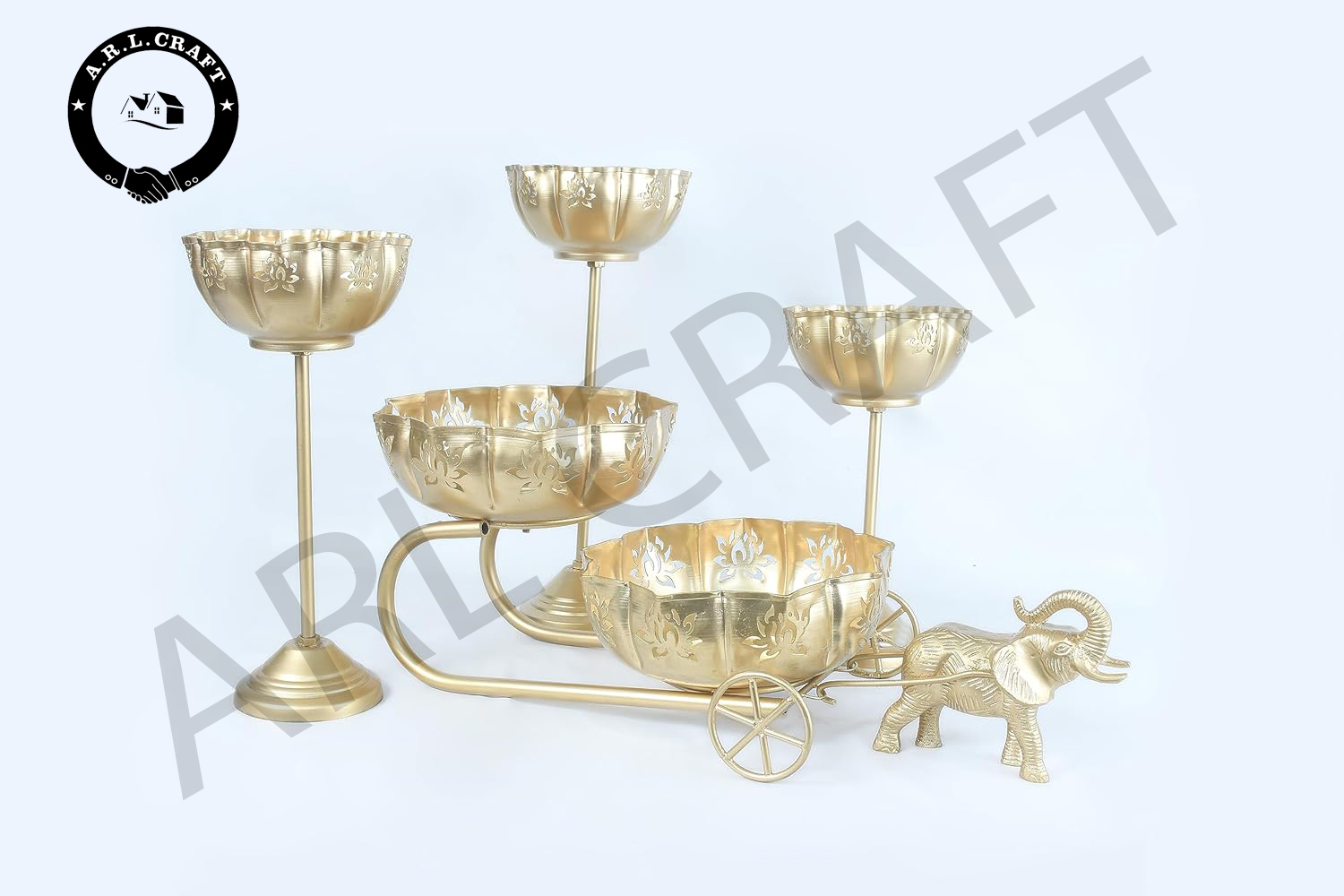 Gold Baggi with 2 Lotus Cut Urlis and 3 Candle Holder Stand | Decorative Traditional Urli Bowl | Baggi Size – 22In, Urli Size – 8In, Stand Size – 14, 12, 10In