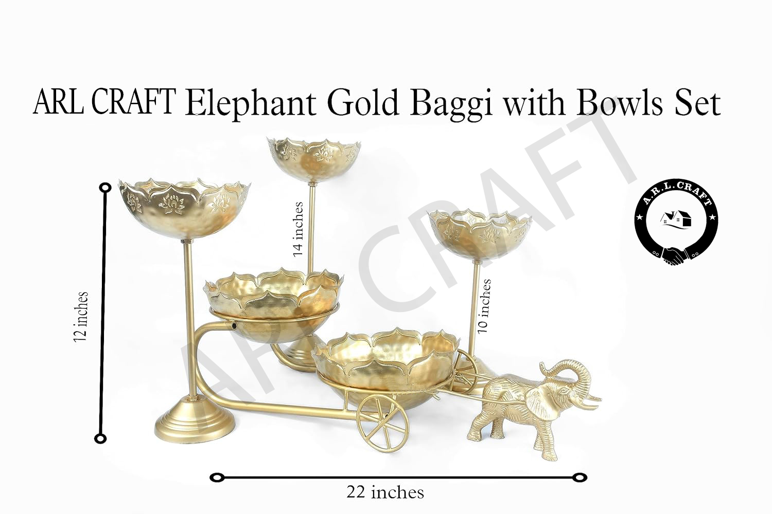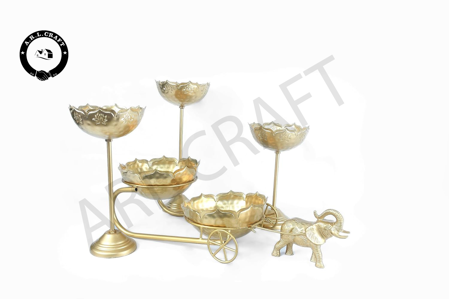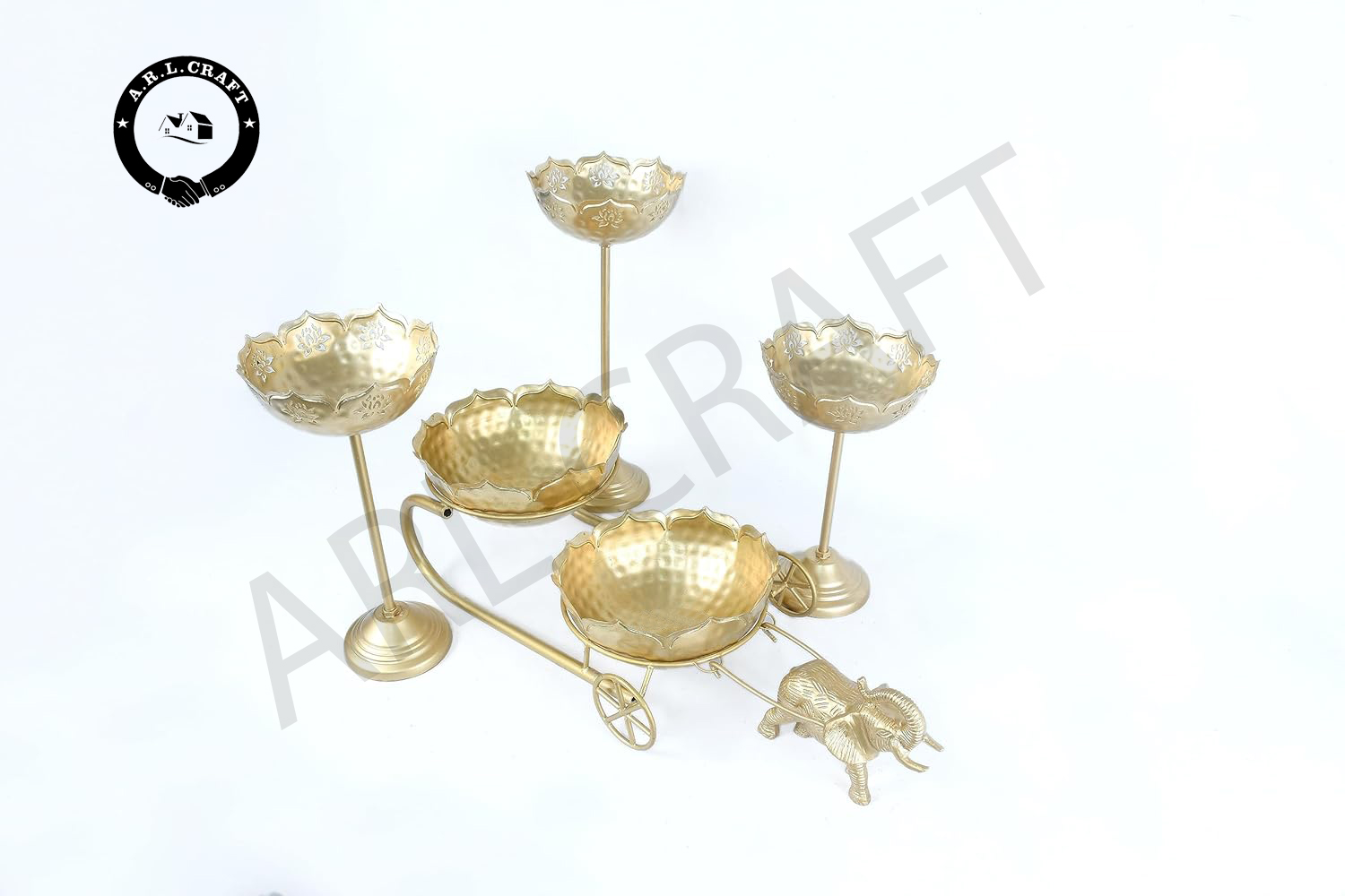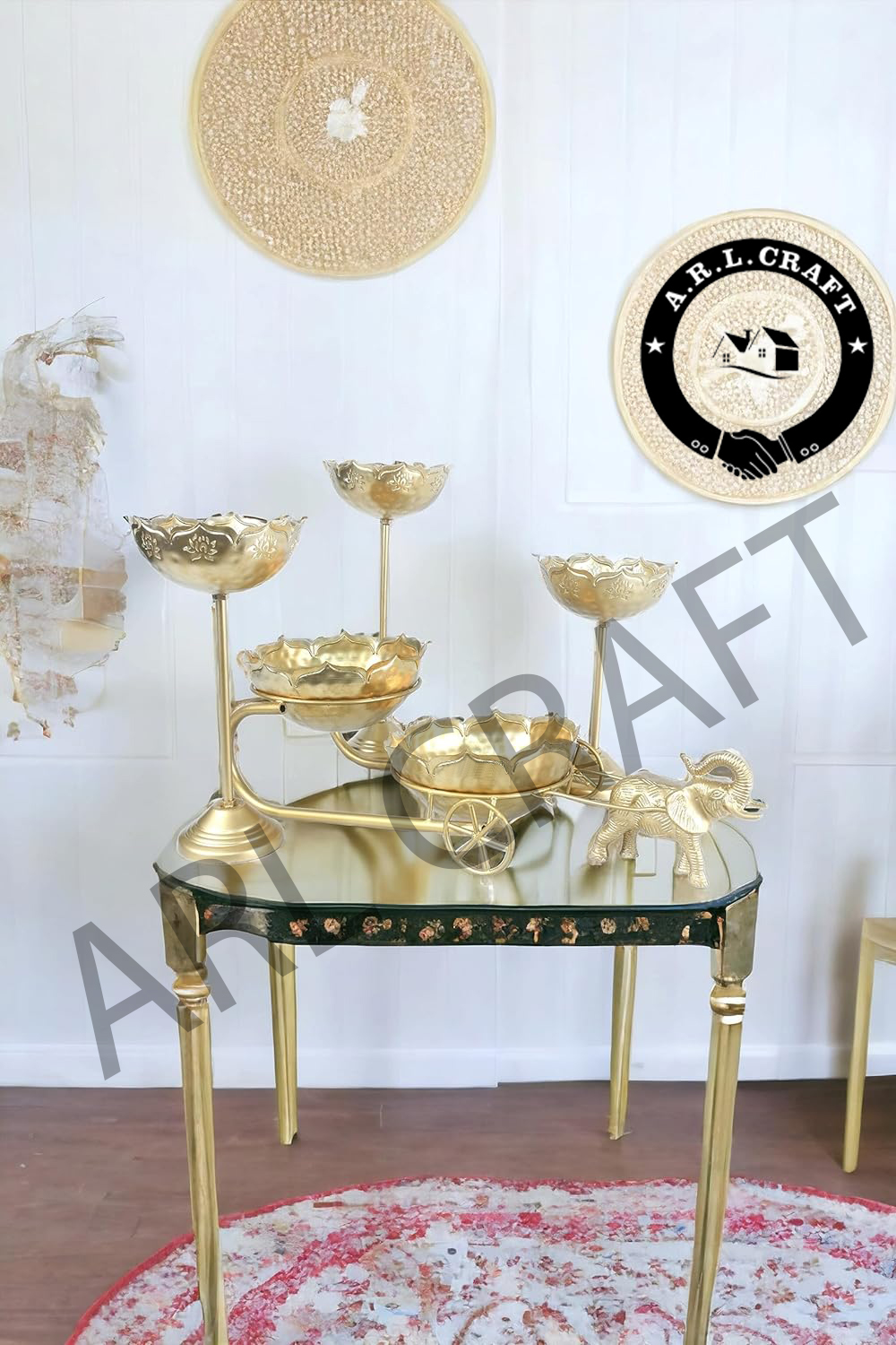 Gold Baggi with 2 Urlis and 3 Candle Holder Stands | Decorative Traditional Urli Bowl | Baggi Size – 22In, Urli Size – 8In, Stand Size – 14, 12, 10In